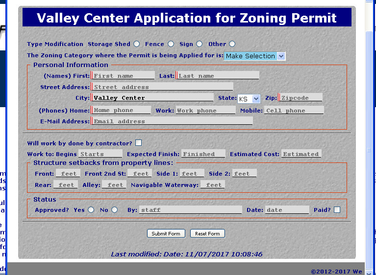 The current method of processing this application is that the user goes to the city website, opens up the pdf form, enters the information, prints it out, signs it and then either faxes it to the number on the form, mail it in, or drops it off at the city hall.The city uses a system called InCode, which is an HR software that has been expanded to also include some permitting.
